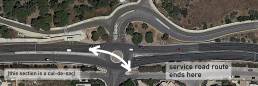 If a bicycle user goes through the safety hassle of crossing the roundabout into this service road to travel back south the journey is cut short as they cannot proceed further south at the end, it will be against traffic. Nor can they cannot cross back onto the other side again.